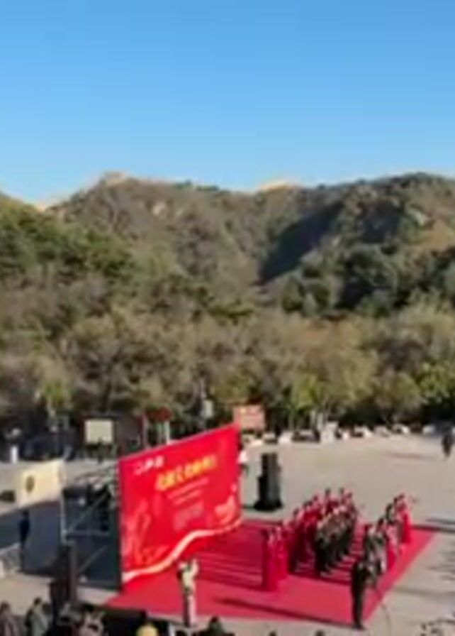 n outdoor event taking place in front of the Great Wall of China on a clear day. A group of people wearing red uniforms stand on a red carpet in front of a large red banner with Chinese writing on it. There are speakers and other equipment set up for the event. A crowd of people is gathered to watch. In the background, the Great Wall snakes across the top of the surrounding mountains. Some people are walking around the plaza area in front of the event. Someone is holding a phone and filming the scene.