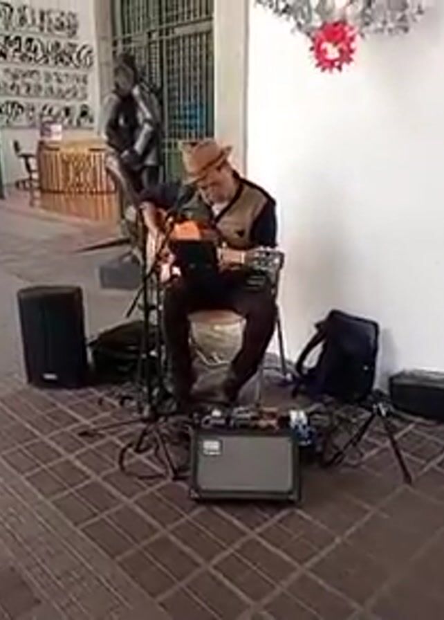A man is performing on a guitar in an outdoor, covered area. He is seated on a chair. He is wearing a hat, vest, dark shirt, and dark pants. He is playing an acoustic guitar that is amplified through a small amp and speaker set up in front of him. Several effects pedals are visible on the ground. Behind him is a white wall decorated with a shiny silver ornament with a red flower. To his left is a statue and a gate. A guitar case and backpack are on the ground. The ground is paved with red brick. He appears to be busking.
