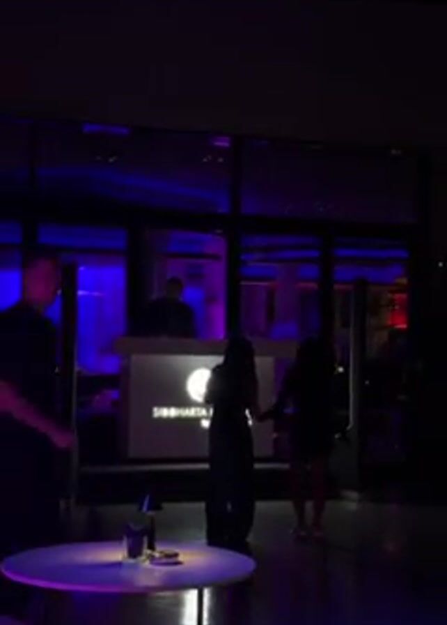 The interior of a darkly lit nightclub is shown. Two women in silhouette dance in front of a raised DJ booth. The booth is lit from behind, showing the DJ and the name “Siddharta Lounge”. Round tables stand in the foreground with candles and drinks on them. People walk through the frame. Blue and red lights fill the room. A mirrored window separates the club from the outside. The video appears to be taken on a phone.