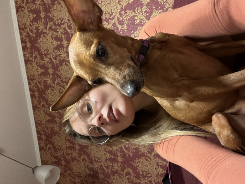 A woman with glasses and blonde hair reclines, facing upward. Her face is visible, with a slight smile. A brown dog with large ears rests on her, its head near hers. The dog wears a purple collar. The background features patterned wallpaper. The woman's arms are visible, wearing peach-colored sleeves. A portion of a white light fixture is seen in the lower left corner. The overall scene suggests affection and comfort.