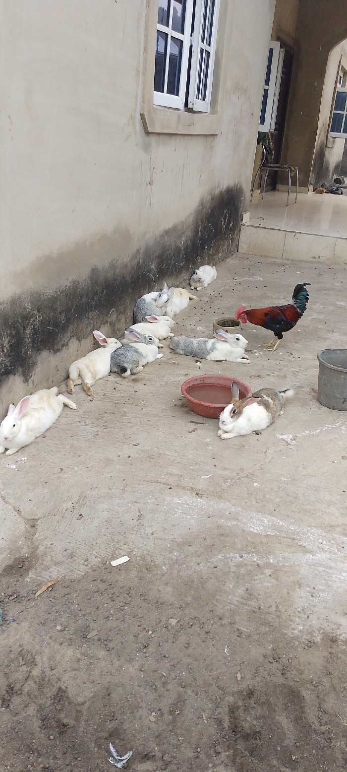 A flock of rabbits rests near a building's exterior. Most are white or white with grey patches, lounging near the wall. A bright red and green rooster stands among them. A shallow, red dish with water rests nearby, as does a grey bucket. The scene takes place on a grey concrete surface, with a window visible on the building, adding natural light. The rabbits are the primary focus.