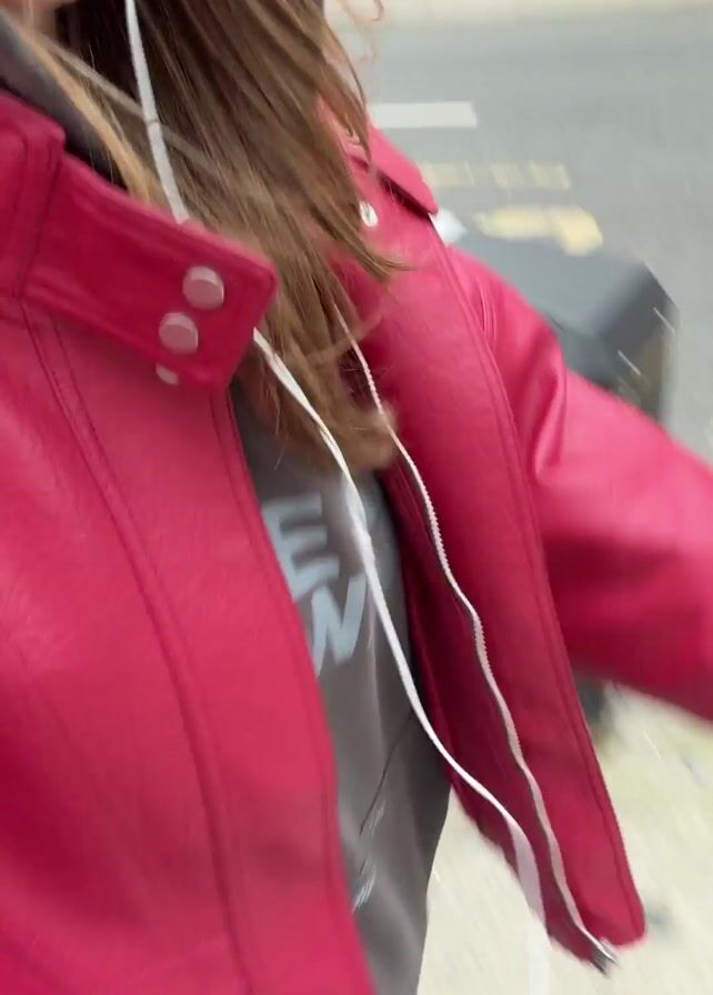 person walking on a sidewalk next to a street. The person is wearing a red leather jacket, a grey t-shirt with blue lettering, and dark pants. They have earphones in. A bus stop sign is visible behind them, and cars pass by on the street. The video is shot from a first-person perspective, with the camera moving as the person walks.