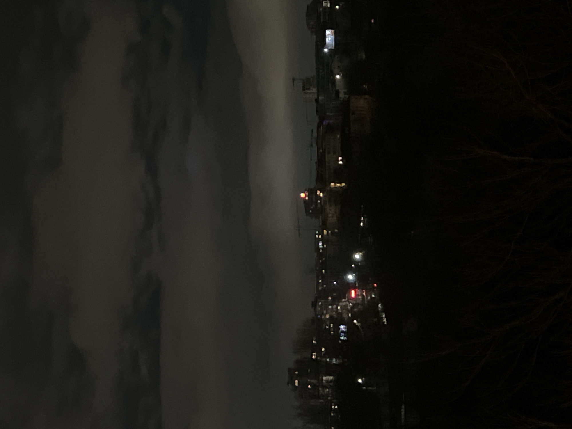 night view in Sofia, Bulgaria. The left side features a grey, cloudy sky. The center depicts city buildings illuminated by lights. The right side shows the silhouette of tree branches against the dark sky.
