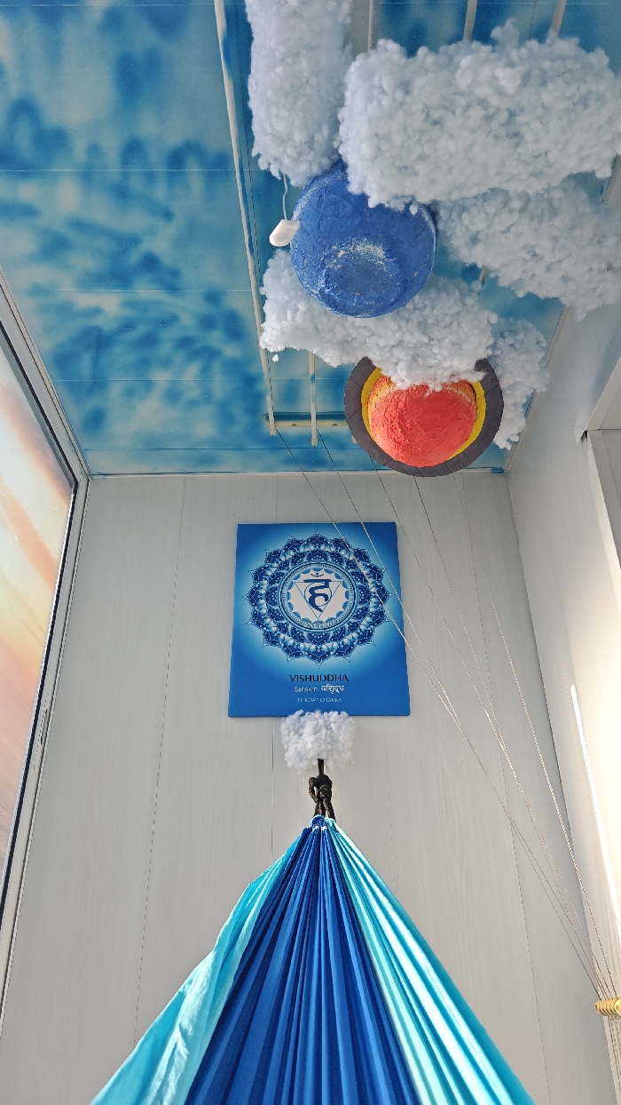 An interior scene depicts a room in Rostov Veliky, Russia, decorated with celestial and spiritual themes. The ceiling features blue tiles with a light blue cloud pattern. Suspended from the ceiling are several white, fluffy artificial clouds. Within these clouds, two spherical objects are visible: one rough-textured blue sphere, and another object with a textured orange/red center encircled by grey and yellow rings, resembling a cross-section of a celestial body. The walls are white with vertical paneling. On the left, a window frame shows a blurred view with an orange light source, possibly sunlight. Centered on the white wall is a blue rectangular print displaying a white and blue Vishuddha (Throat) Chakra mandala, with the text "VISHUDDHA", "संसर्ग चक्र", and "THE THROAT CHAKRA". Below the chakra print, a large, two-toned fabric object, striped in dark blue and light blue, is gathered into a point and suspended. This object, likely a swing or hammock, is attached by a black braided cord to the wall, beneath which a small cluster of white fluff is present. To the right, multiple thin, light-colored strings or wires descend from the ceiling, some adorned with small gold-colored cylindrical beads towards the bottom right of the frame. No individuals are present in the image.