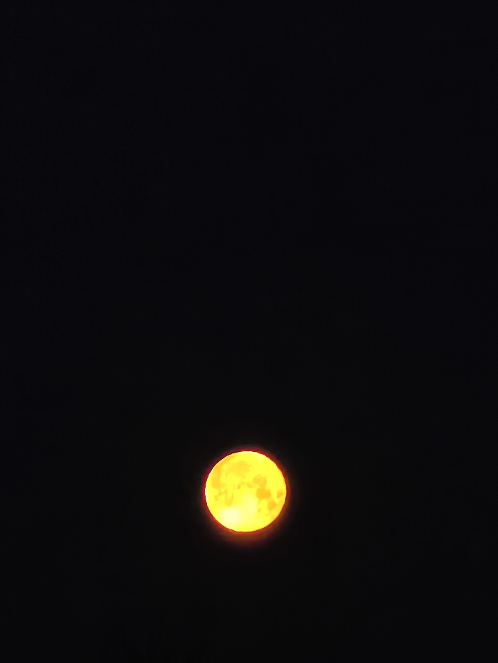 The image presents a full or nearly full celestial body, identified as the Moon, against a uniformly dark, black background, indicative of a night sky. The Moon is rendered in vibrant yellow hues, featuring a pronounced reddish-orange halo or rim. Subtle variations in shade, possibly surface features, are discernible on its illuminated disc. No other celestial objects, atmospheric conditions, or terrestrial elements are visible. There are no individuals, other subjects, actions, or interactions depicted. The specific location within the city of Slavyanovo, Bulgaria, cannot be determined from the visual information contained within this image.