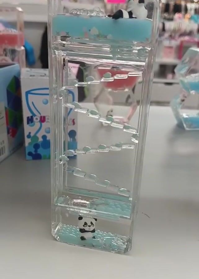 clear plastic liquid timer featuring two panda figures. The timer is rectangular and contains clear liquid with a bluish tint. Inside, a zig-zagging path with small indentations guides the liquid as it flows from the top to the bottom of the timer. A small panda figure rests on the top, appearing to relax on the surface of the liquid. Another panda figure is at the bottom, seemingly swimming in the liquid. The timer sits on a white shelf in what appears to be a store aisle, with other items and blurred backgrounds visible. A box is to the left of the timer.