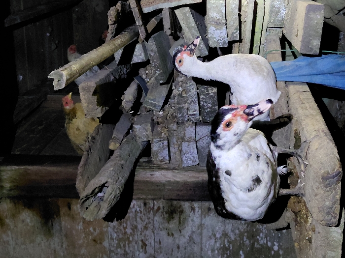 The image captures an interior scene in Blang Pohroh, Indonesia, under dim, focused artificial light. In the foreground, two Muscovy ducks are positioned on a rough, weathered wooden beam. The duck on the left displays black and white plumage with distinct red and black caruncles around its eyes and beak, its head lowered and facing right. The duck on the right is primarily white, with red-pink coloration around its beak and eyes, standing upright and facing right. A blue piece of fabric hangs vertically from a beam behind the white duck. In the mid-ground, a cluttered structure composed of stacked, irregular wooden elements, possibly mixed with stone or concrete blocks, supports at least two light-brown chickens, each exhibiting a red comb and wattle. The environment is characterized by aged wooden planks and beams forming the structure, with most of the background obscured by darkness due to limited illumination. Scattered debris is visible on the foreground beam.