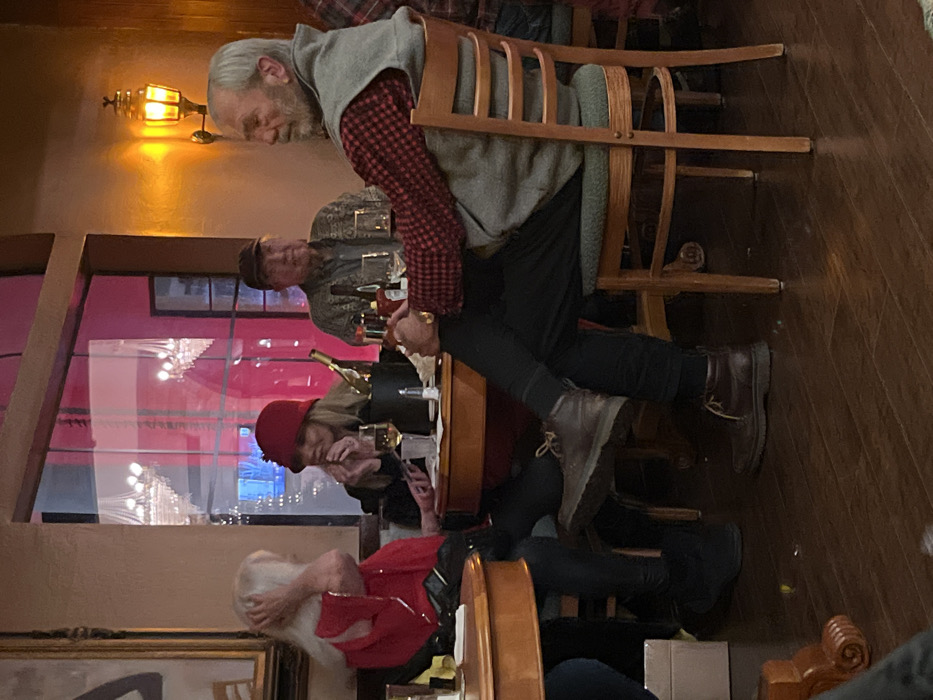 A group of people sit at a table in a restaurant. An older man with a grey vest and red and black checkered shirt is at the head of the table. A woman in a red hat sits across from him, looking at a cell phone. Bottles of wine are on the table. A man in a camouflage jacket is seated behind the woman. A woman with white hair is at the other end of the table, wearing a red shirt. A wall sconce is visible behind the man in the vest.