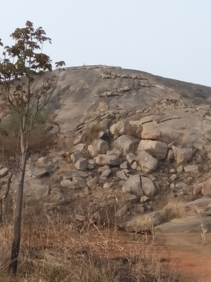 The image displays a rocky, arid landscape located in Kerang, Nigeria, under a bright, overcast sky. A large, smooth-faced rock formation, grey to light brown in coloration, constitutes the primary feature, sloping upwards from the midground towards the background. The lower and middle sections of this formation are densely covered with numerous scattered boulders and smaller rocks of varied sizes and irregular shapes, some exhibiting visible cracks. A distinctive, winding arrangement of flattened rocks forms a segmented path or natural geological feature ascending the upper slope of the main rock mass, leading towards a relatively flat summit. In the foreground on the left, a slender tree with a light-colored trunk and sparse, dark green foliage stands vertically. The ground in the foreground consists of dry, straw-colored grasses and patches of reddish-brown earth, with a notable reddish-orange section of exposed soil visible on the far right. No individuals, animals, or identifiable man-made structures are present in the scene, beyond the natural or constructed rock path.
