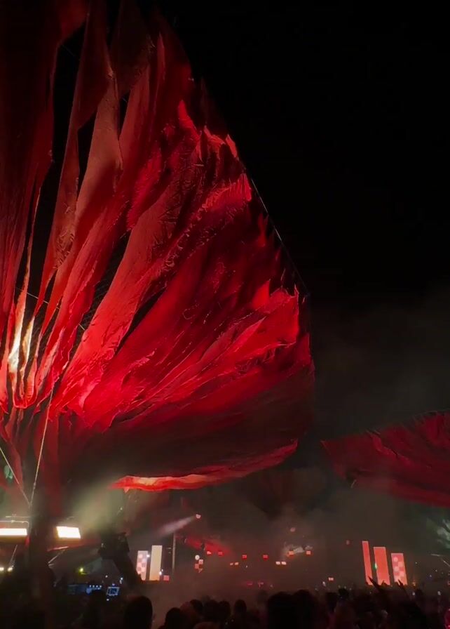 A crowd of people is gathered at night for a concert or event. Red fabric strips hang from the top, creating a canopy. Light beams shine across the stage, and there is some smoke or haze in the air. People are standing and moving, presumably watching the performance.