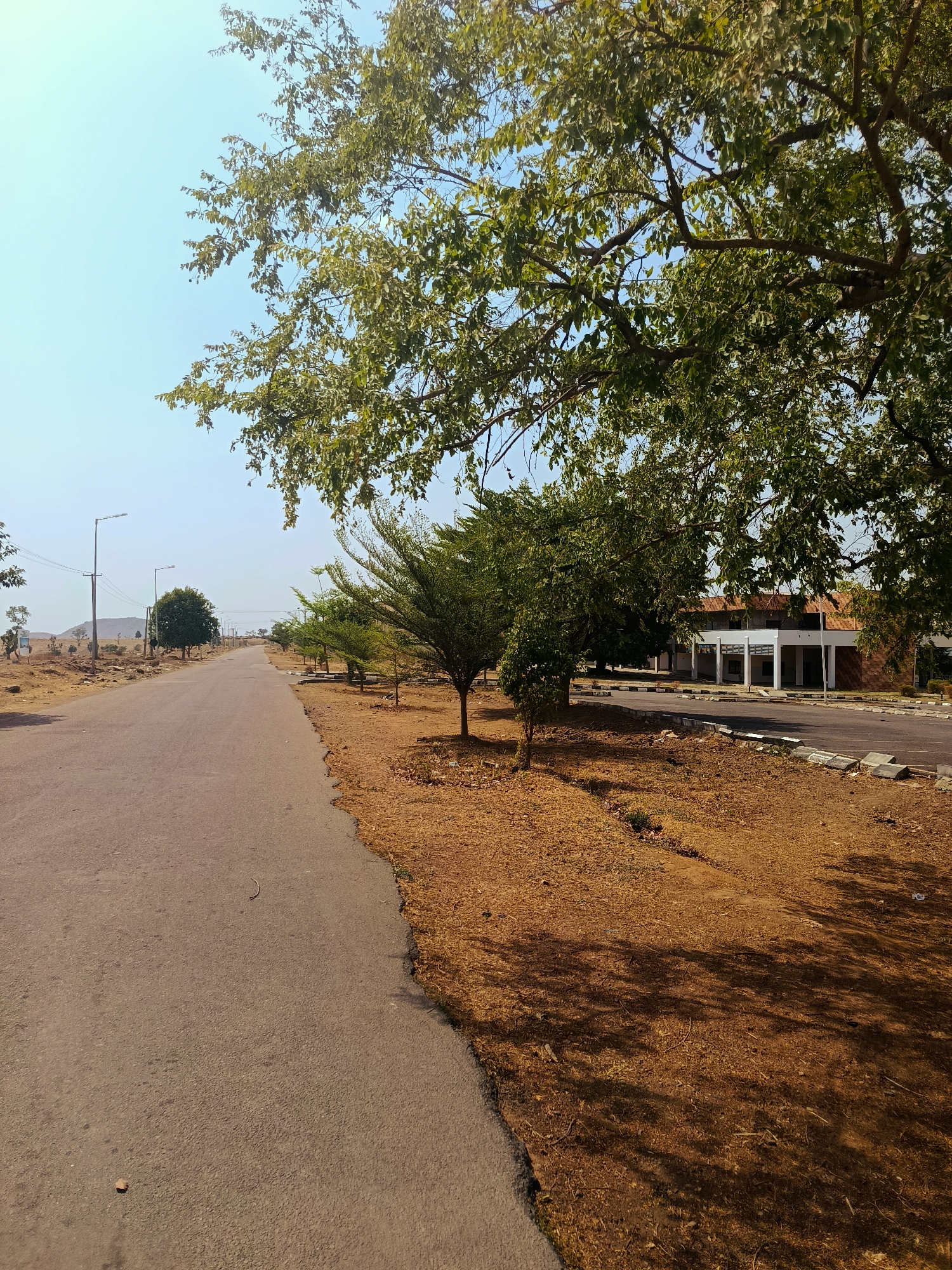 A road in Rafin Pa, Nigeria stretches into the distance, flanked by trees and arid ground