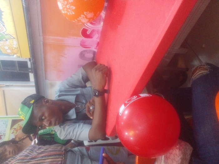 The image depicts an indoor scene within a Logos Foods restaurant, located in Lagos, Nigeria. The central figure is a young Black male, appearing to be in his mid-20s, seated at a red rectangular table with white sides. He wears a light blue short-sleeved polo shirt with a zipped collar, a silver chain with a circular pendant, a silver ring on his right hand, and a black digital wristwatch on his left wrist. He is also wearing a green and black baseball cap with a yellow logo, identifiable as a New Era cap. His arms are resting on the red table, and he is looking intently towards his left, away from the camera. Partially visible on the left side of the frame, another individual stands, wearing light-colored, possibly ripped, blue jeans and a vertically striped shirt. This person's left arm is visible, holding a blue smartphone. In the blurred background, behind the seated man, a young Black female with dark hair is visible, wearing a green garment and a dark strap, looking generally towards the left. The environment includes two balloons: a large red balloon with white lettering (partially visible) rests in the lower-left foreground, near the standing person's leg, and an orange balloon with white floral patterns is on the right side of the red table. The background features a wall with faded orange and white graphic elements, clearly displaying the white text "LOGOS" behind the seated man. Above this, a white counter or shelf is visible, with a sign featuring a yellow cartoon character and the text "POP". A window with white framing is also visible in the upper background. The lighting in the scene is artificial.