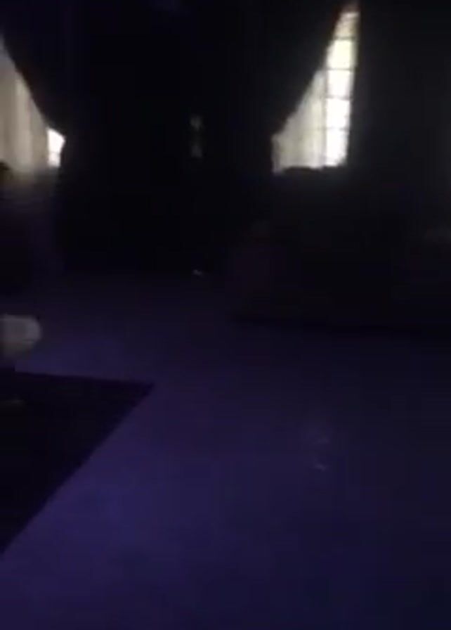 darkened room with two windows covered by dark curtains. Light from the windows penetrates, revealing the outlines of furniture, including a couch, a table, and potentially other objects. An LED light fixture hangs from the ceiling, casting a purple glow. The camera seems to be held by someone standing and panning upwards slowly to capture the light. The room appears dimly lit.