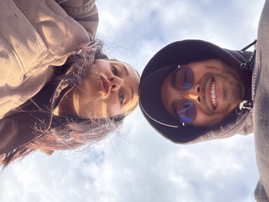 The image displays two individuals, one female and one male, captured from a low-angle perspective against a sky backdrop in Zlatograd, Bulgaria. The female subject occupies the upper portion of the frame, oriented upside down. She has long, dark hair and wears a light brown jacket or top, with a thin gold-colored chain visible around her neck. Her face is presented with visible blue eyes looking directly at the camera, and her lips are pursed. Sunlight illuminates the left side of her face and hair. The male subject is positioned in the lower portion of the frame, appearing upright. He is smiling, revealing teeth and dimples. He wears a dark hooded sweatshirt with the hood pulled up and a dark baseball cap beneath the hood. He also wears gold-framed sunglasses with blue-tinted lenses, which reflect the sky. Partial lettering, indicative of "BALENCIAGA," is discernible on the front of his sweatshirt. Both subjects are looking towards the camera. The background consists of a clear blue sky interspersed with scattered white clouds, suggesting an outdoor, daytime setting.