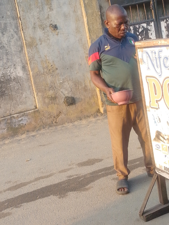 A middle-aged man stands outdoors, holding a red bowl. He wears a collared shirt with Puma and Italy logos, along with brown pants and sandals. He stands beside a sign displaying "Nife" prominently. The background includes a textured gray wall and a partial view of a barred window. The scene is illuminated by sunlight, casting shadows on the street.