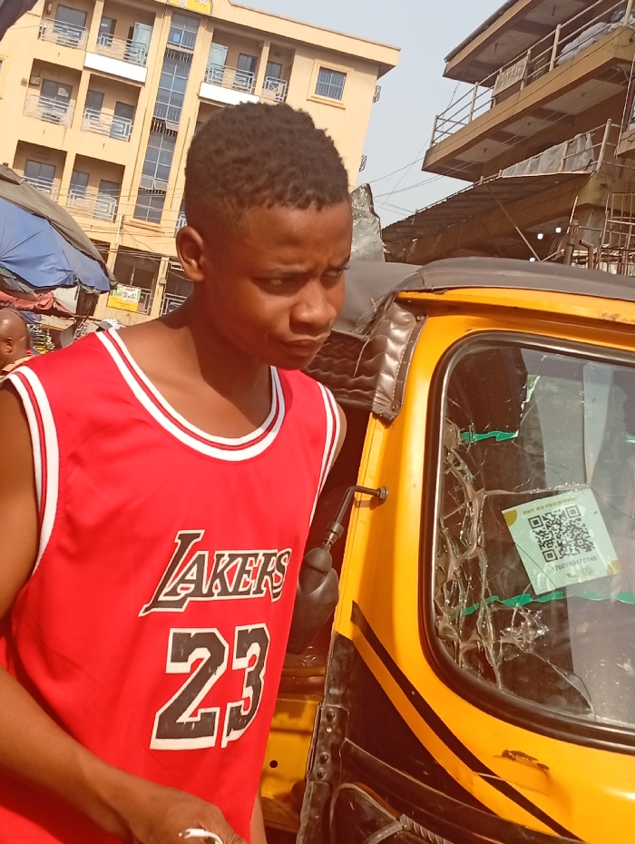 A young male stands on a street in Fegge, Nigeria, positioned next to the cab of a yellow and black three-wheeled vehicle. The male, with short, dark, textured hair, wears a red sleeveless jersey featuring "LAKERS 23" in white print. His head is turned slightly to the right, and his gaze is directed downwards. The front windshield of the adjacent three-wheeled vehicle is extensively shattered, displaying numerous cracks. A light green sticker with a black QR code and the text "PAY AS YOU RIDE" and "1760789170746" is affixed to the damaged windshield. In the background, multiple multi-story buildings with balconies are visible under a bright, hazy sky. A blue tarp or awning is partially visible to the left, and a portion of another individual's head and shoulder can be seen behind it. The scene depicts an urban setting, likely a commercial or market area.