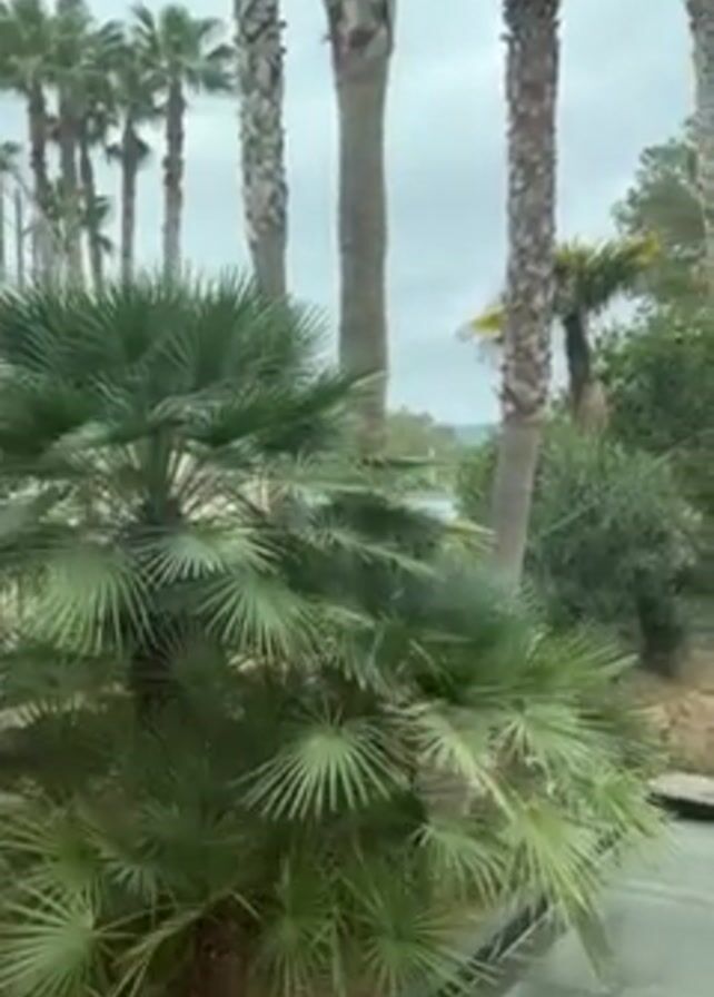 view from a window. A small palm tree is visible close to the window, with taller palm trees extending into the distance, under a cloudy sky. A body of water is visible between the trees. Water can be seen on the ground near the window. The window frame is visible along the left side of the shot.