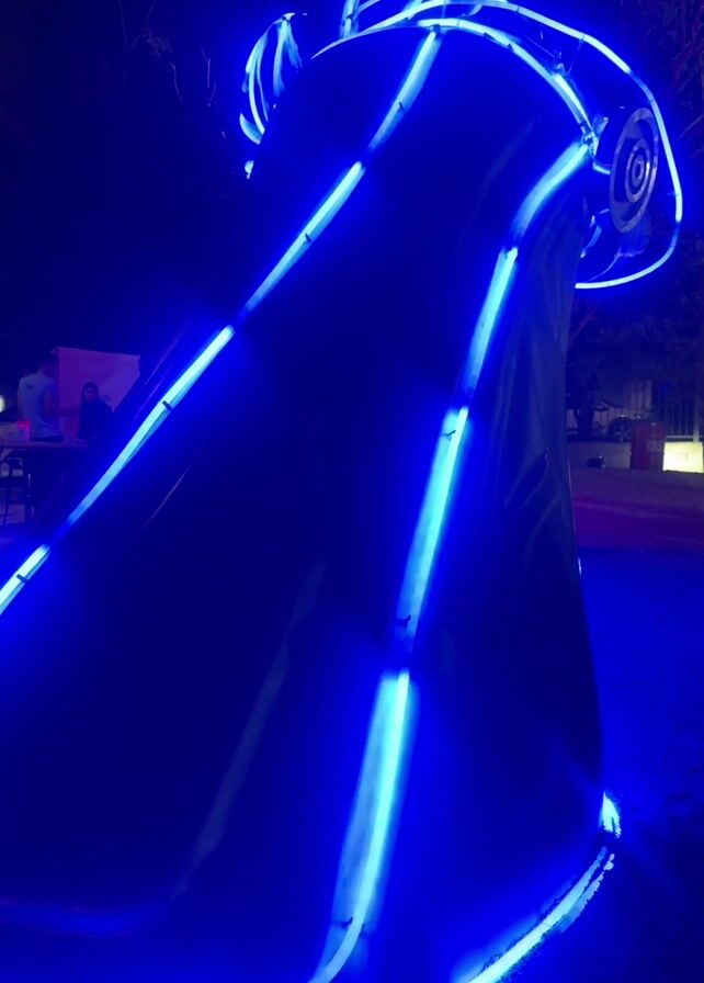 At night, an oddly-shaped structure glows with brilliant blue neon lights. The structure is dark underneath its linear neon highlights. At its top is what appears to be a speaker. In the distance, there are a few people sitting at a table, and someone walking by.