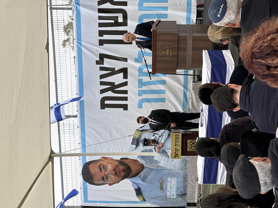 The image depicts an outdoor memorial or funeral ceremony in the city of Meitar, Israel
