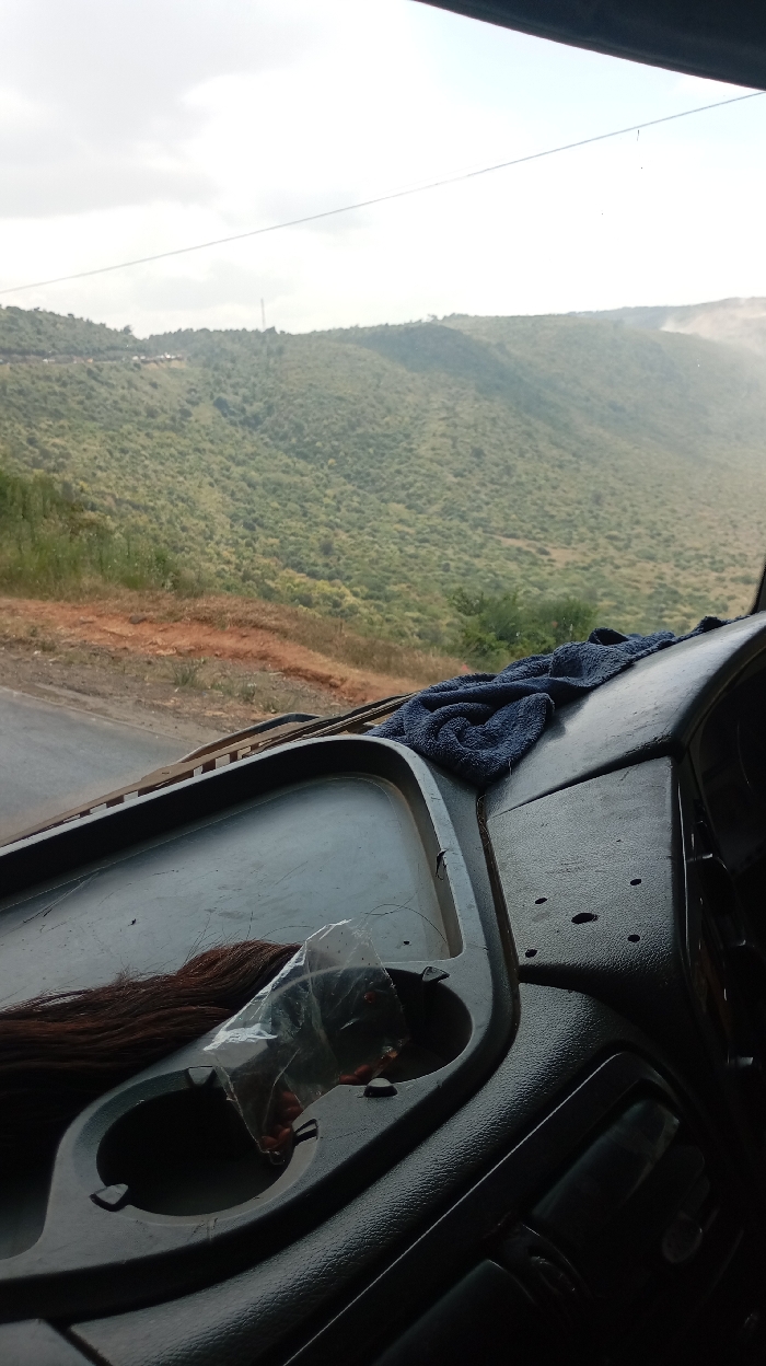 The image depicts a panoramic view from the interior of a vehicle, facing outwards towards a mountainous landscape in Lari/Kirenya ward, Kenya