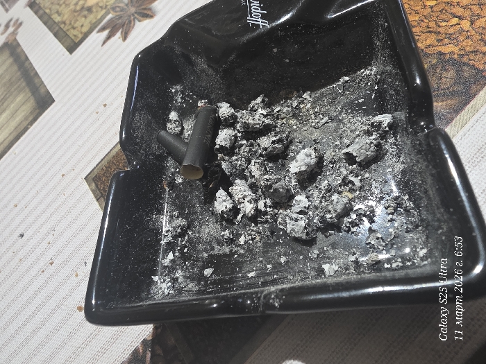 The scene depicts a black, rectangular Davidoff-branded ashtray resting on a table in Vratsa, Bulgaria