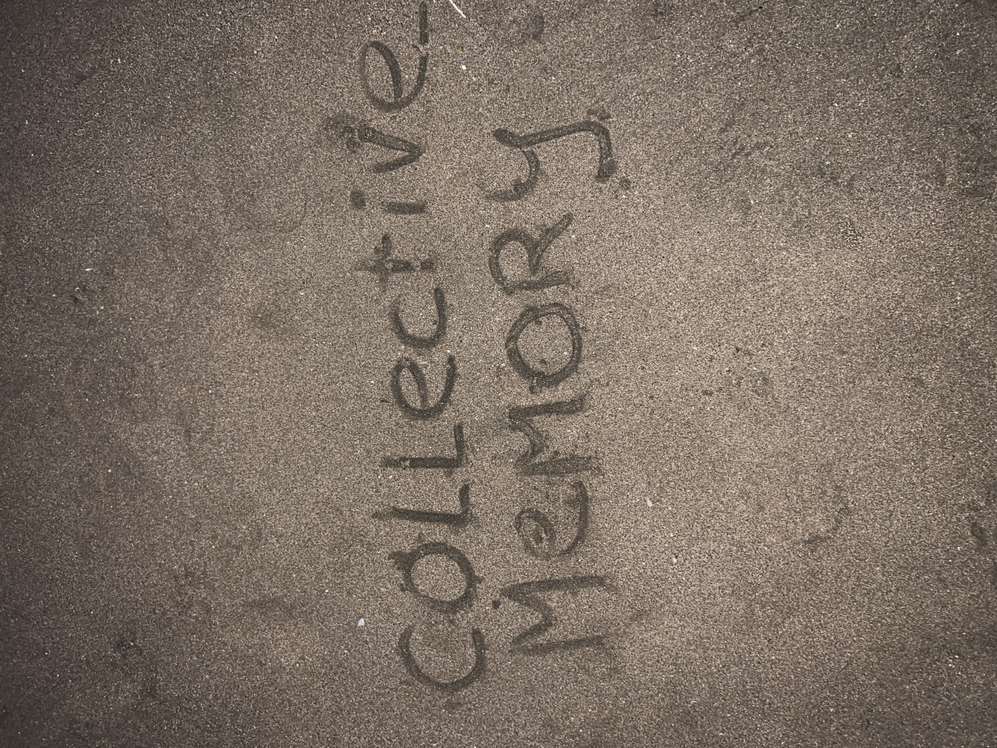 A downward-angle forensic image depicts a textured, dark grey-brown sandy surface located in Kerobokan Kelod, Indonesia. Inscribed into the damp, fine-grained sand are the words "Collective Memory." The word "Collective" is centered on the upper line, with "Memory" centered directly beneath it on the lower line. Each letter is formed by a depression in the sand, consistent with being drawn by a finger or slender implement. No individuals, additional objects, or direct actions are present or depicted within the frame. The lighting is uniform, suggesting an overcast environment or indirect illumination.