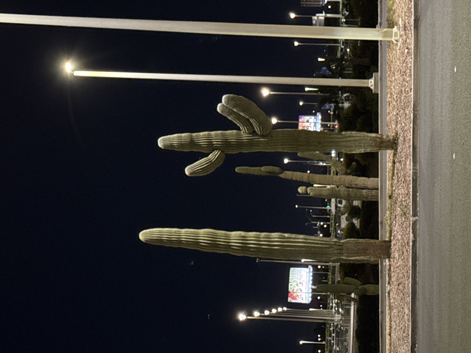 The image displays an urban night scene in Paradise, United States of America. In the foreground, a dark asphalt road surface is visible, bordered by a strip of light brown gravel or mulch. Situated within this landscaped strip are multiple saguaro cacti. Three large cacti are prominent: a tall, single-column saguaro on the left, and two multi-armed saguaro cacti on the right, each exhibiting characteristic ribbed stems. Additional smaller saguaro cacti and dark vegetation are present further back. Numerous tall, slender streetlights with bright, yellowish-white luminaires illuminate the area; two are distinctly visible on the far right, and a line of them recedes into the left background. In the mid-ground and background, various artificial lights are present, including additional streetlights and brightly illuminated billboards or signs. Vague outlines of distant vehicles and structures can be discerned. The sky overhead is a dark, clear blue-black. No individuals are visible in the scene.