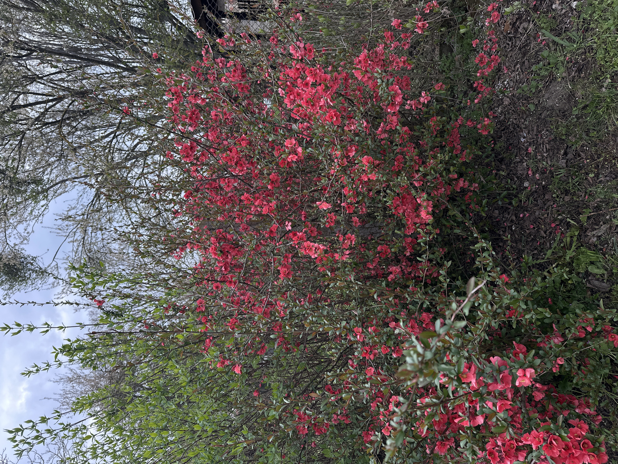 The image depicts a flowering bush with red flowers. The bush is dense with many blossoms. There are tree branches with fresh green leaves visible in the background. To the right of the bush, there is ground covered in leaf litter and some green vegetation. The image is taken outdoors, likely in a garden or park setting. The city of Aglen, Bulgaria is not directly identifiable in the photograph and thus cannot be confirmed. The presence of people, specific objects, actions, and interactions cannot be ascertained based on the image. The environment is generally characterized by nature and plant life.