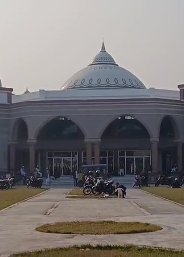 wide shot of a large building with a central dome and two smaller domes on either side. The building has arched entrances and columns. There is a wide pathway leading up to the building. The area in front of the building is a grassy field, where several people are sitting or standing. Numerous motorcycles and auto rickshaws are parked on the perimeter of the field. The sky is overcast, creating a diffused light. The building and its surroundings appear to be in a public gathering place. A sign is visible on the right side of the frame.