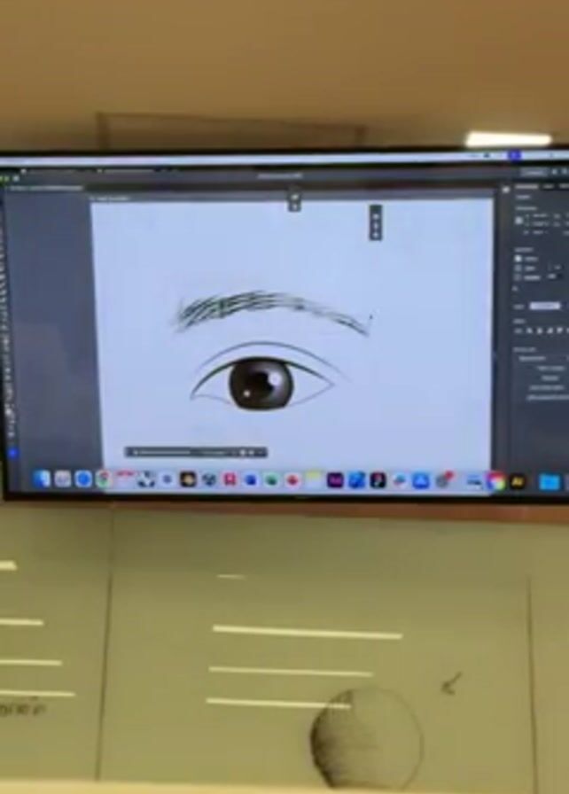 A flat panel display shows an illustration of an eye with an eyebrow above it. The illustration is displayed on a white background. The eye has a brown iris and a black pupil. The eyebrow is dark grey. A computer screen is visible below the flat panel display. There is a white board with writing on it. The ceiling is white.