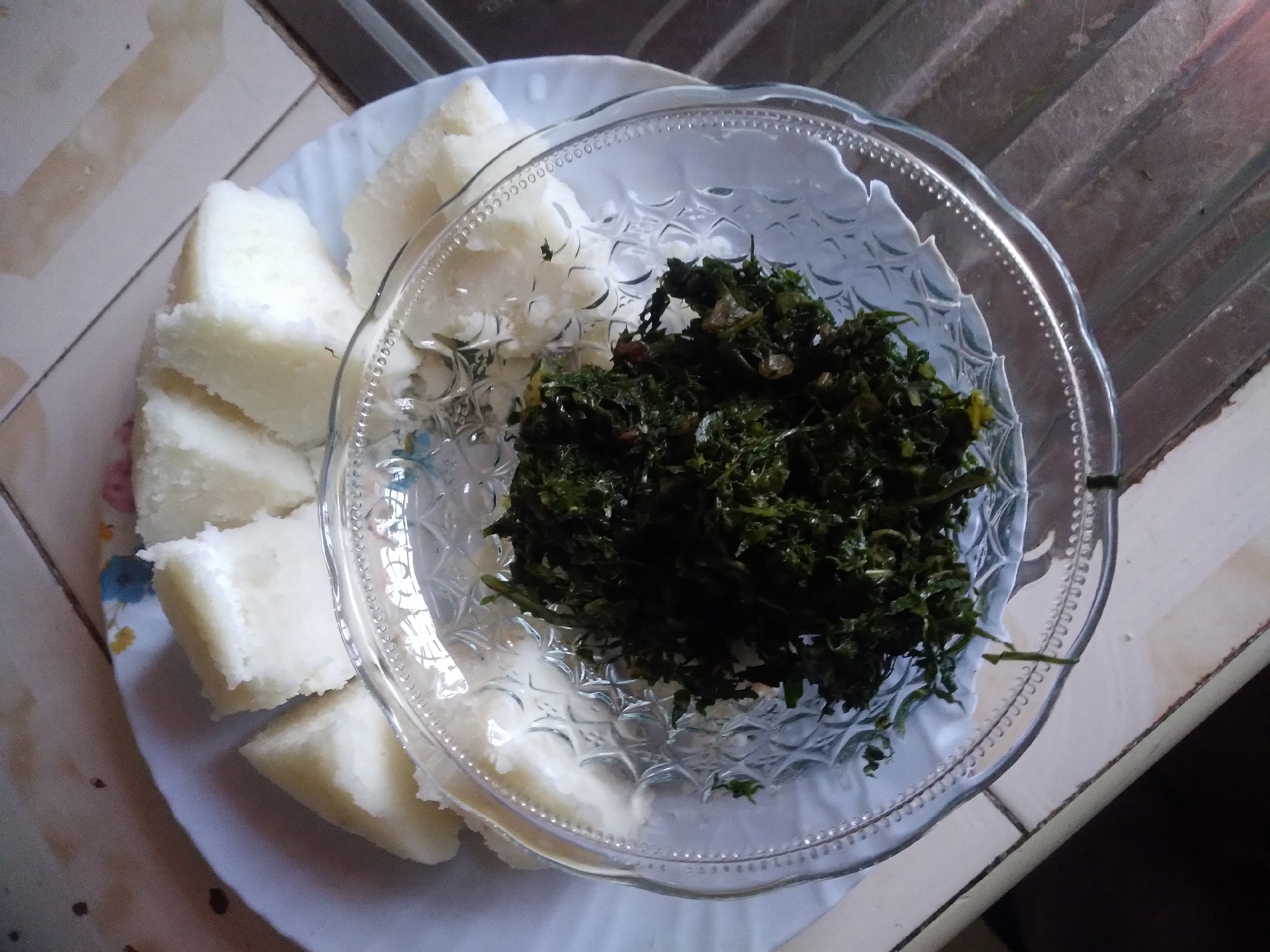 A plate of food is set on a tiled surface. The food consists of white, slightly uneven blocks of what appears to be cooked doughy carbohydrate, alongside a clear glass bowl containing a dark green, leafy vegetable dish. The tiling suggests an indoor environment, possibly a kitchen. No people are visible. The exact location in Nyeri, Kenya, cannot be determined from the image.