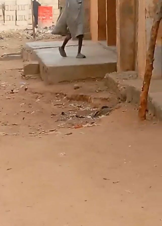 A young person in a gray garment walks away from the camera. The individual has their hands behind their head, and they are standing on a concrete platform. The platform is in a sandy, dusty area. A building with orange or brown columns is to the right of the platform. In the background, there are piles of concrete blocks, and another individual is standing in the distance. There is debris and trash scattered around the ground. A skinny tree trunk stands to the right of the frame.