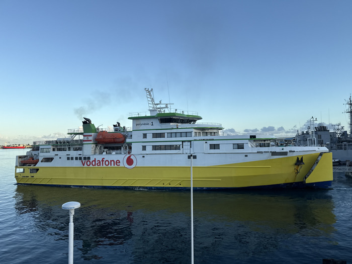 The image displays the passenger and vehicle ferry "polynésie 1" in the harbor of Papeete, France