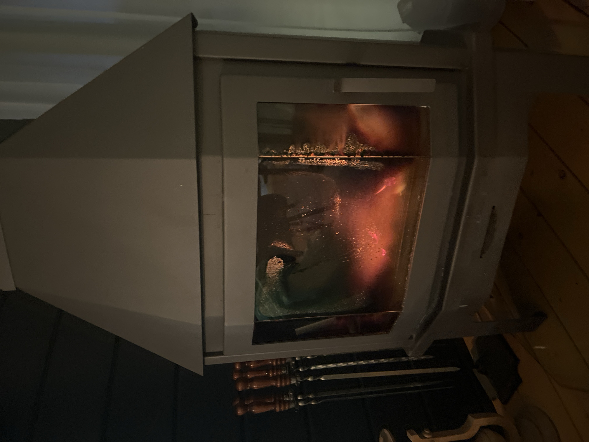 An indoor, canted shot shows a metal fire pit appliance with a glass door. Inside, a fire is burning, leaving dark residue along the bottom of the glass. A set of cooking skewers with wooden handles sits on the edge just below the appliance's door. The location is in the city of Новая Чернушка, Russia. The environment is dark, but some wooden paneling is visible on the right side.