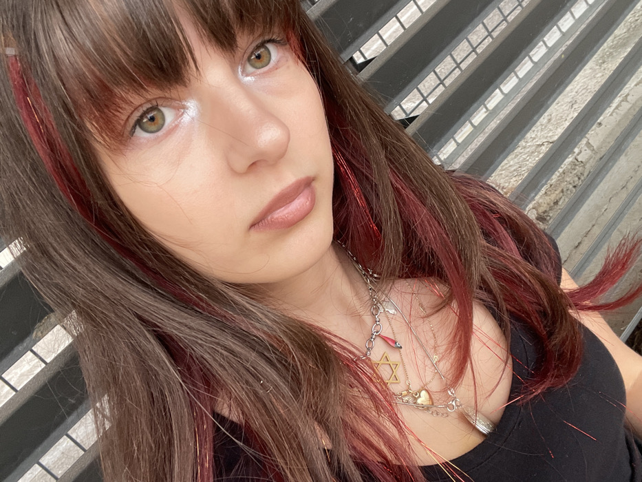 The image presents an angled, close-up portrait of a young woman, captured from the chest up. She possesses long, dark brown hair featuring distinct red/burgundy highlights and integrated metallic tinsel strands, styled with bangs across her forehead. Her eyes are green/hazel, with a pronounced white highlight applied to the inner corners, and her lips are colored with a light pinkish-nude tone. She is clad in a dark, likely black, top. Multiple silver-toned necklaces are worn around her neck; one prominent necklace displays charms including a gold-toned Star of David, a red hamsa, and a silver heart. The background is out of focus, revealing a structural element composed of horizontal slats or bars, indicative of an outdoor setting under daylight conditions with discernible shadows. The specific location within the city of Kfar Saba, Israel, is not discernible from the visual information provided in the image.