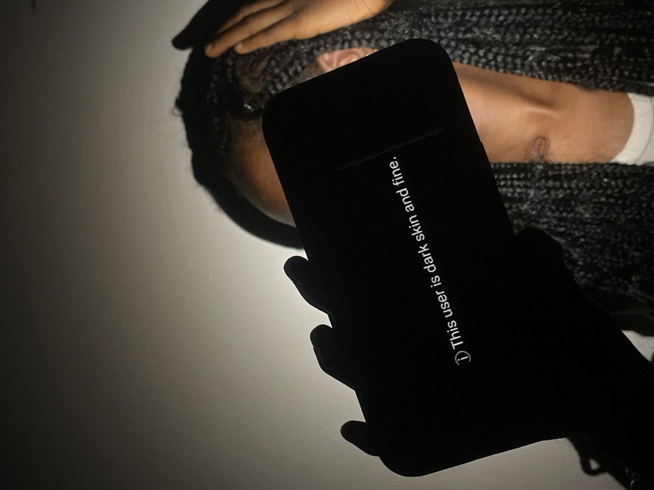 A person with dark skin and braids lies on a surface. A smartphone with the text "This user is dark skin and fine." is held up, obscuring part of the person. The lighting is dramatic, creating strong shadows on the wall and emphasizing the phone's silhouette. The scene has an intimate, possibly self-reflective, mood.