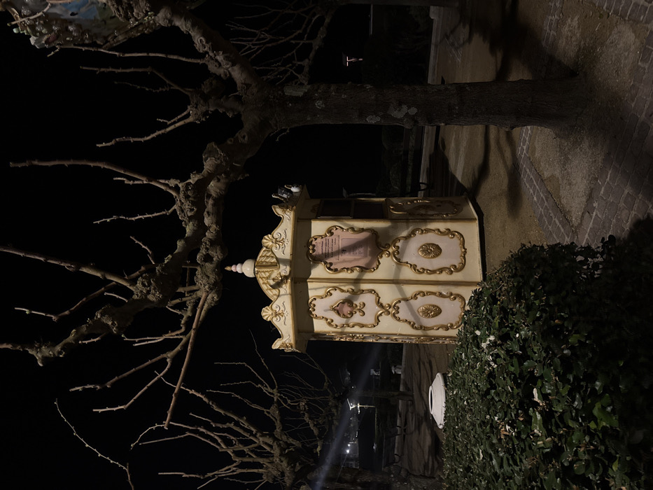 - "An ornate, cream-colored, octagonal kiosk with gold rococo-style trim and a domed roof featuring a finial stands centrally in a public park or square in Biarritz, France, under artificial night lighting" by FM-qzRJ63, licensed under CC BY 4.0