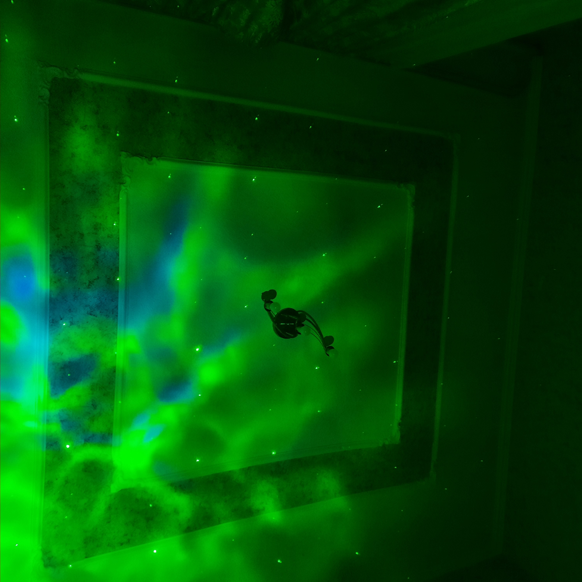 - "The image displays an interior ceiling in Kurganinsk, Russia, illuminated by a green and blue light projection simulating a cosmic nebula with scattered white points resembling stars" by FM-D9pww1, licensed under CC BY 4.0
