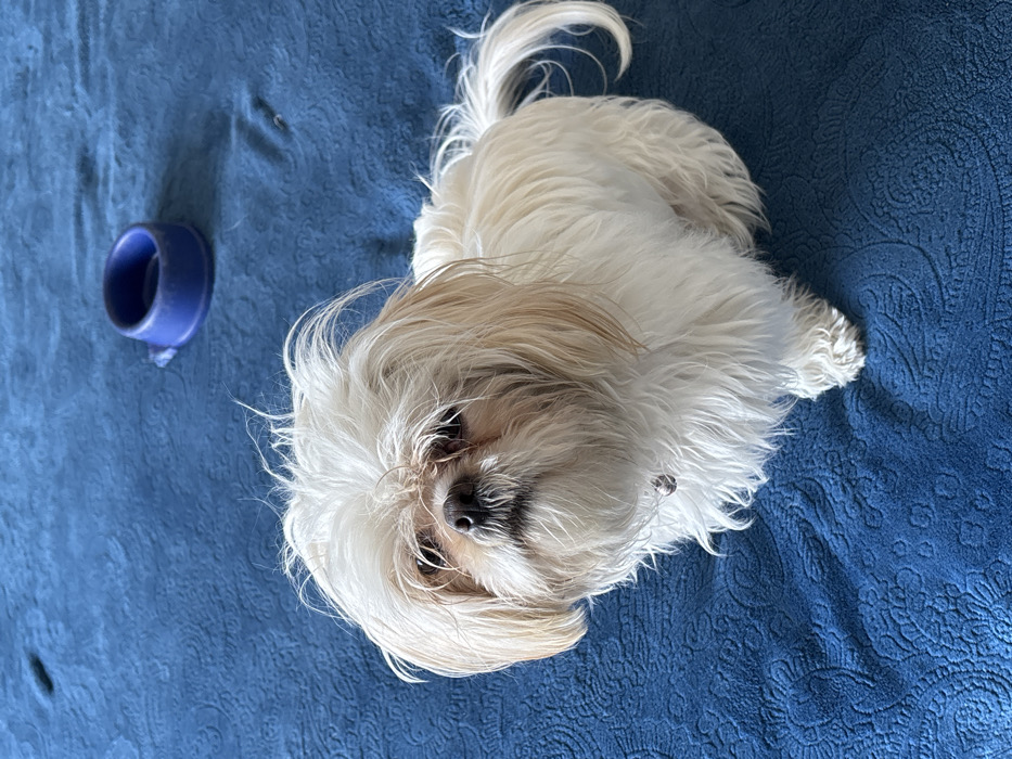 - "A small, fluffy, light-colored Shih Tzu dog is lying on a blue textured bedspread" by FM-IT8bv2, licensed under CC BY 4.0