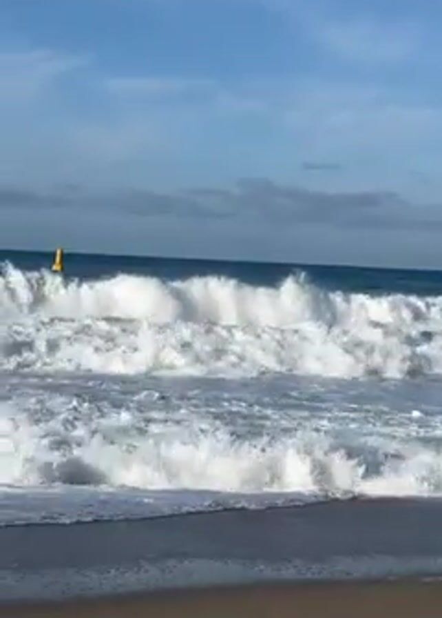 beach scene. Waves with white foam crest and roll towards the shoreline. The beach sand is visible in the foreground. In the distance, the ocean meets a blue sky with scattered clouds. A yellow buoy is seen bobbing in the water.