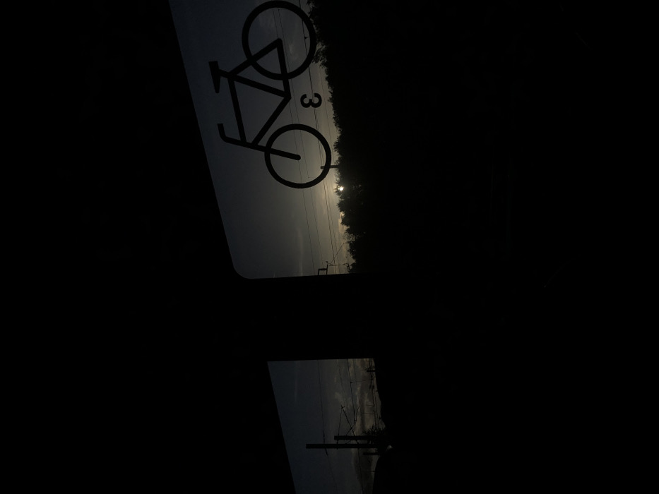 A dark, low-light photograph taken from inside an enclosure, likely a train, in Mundolsheim, France. Through the left window, railway infrastructure is visible, including dark vertical poles and overhead wires against a twilight sky. The right window features a black bicycle silhouette with a stylized 'E' beneath it, adhered to the glass. Beyond, a dense line of dark trees on the horizon partially obscures a bright, circular light source (sun or moon) low in the sky, with horizontal wires visible above the trees. The interior foreground is uniformly dark and devoid of discernable subjects or actions.