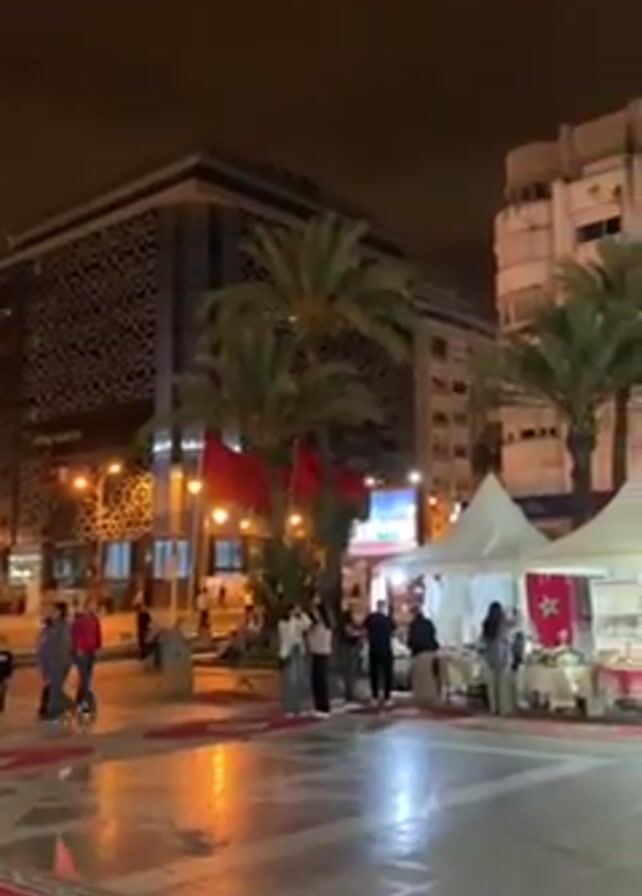 At night, a public square in Morocco, paved with light-colored tiles, hosts a market. Several white tents, decorated with the Moroccan flag, stand in a row. People are milling around, browsing the goods on display within the tents. Palm trees add a tropical touch. Buildings surround the square. A building with a decorative, patterned facade is to the left, with more conventional white apartment buildings to the right. The overall lighting is bright, casting reflections on the polished square.