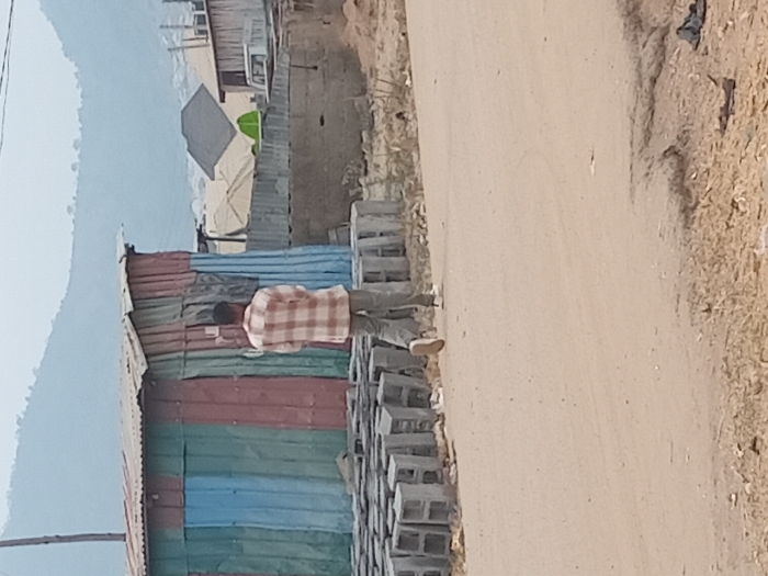 A male individual is observed from behind, walking rightward on an unpaved dirt road in Dam Camp, Nigeria. He wears a light-colored plaid shirt and light-colored trousers. To his left, a large stack of grey concrete cinder blocks lines the road. Behind the blocks and the individual, a single-story structure with vertically striped corrugated metal siding (green, blue, red) and a rusted corrugated metal roof is visible. Further in the background, additional structures with corrugated metal roofs, a partial white vehicle, and tent-like coverings are present. A thin, dark pole stands vertically near the leftmost structure. Distant, hazy mountains form the backdrop under a pale sky. The ground is dry and dusty with sparse vegetation/debris along the road's edge.