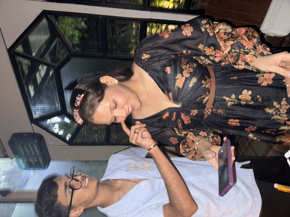 A woman with a "birthday girl" tiara in a floral dress touches a man's nose with her finger. The man wears glasses and a light-colored shirt. The woman has a gold necklace and bracelet. She also wears a ring. The man holds a phone in his right hand and wears a bracelet on his left wrist. A uniquely shaped window with a dark frame is visible in the background.