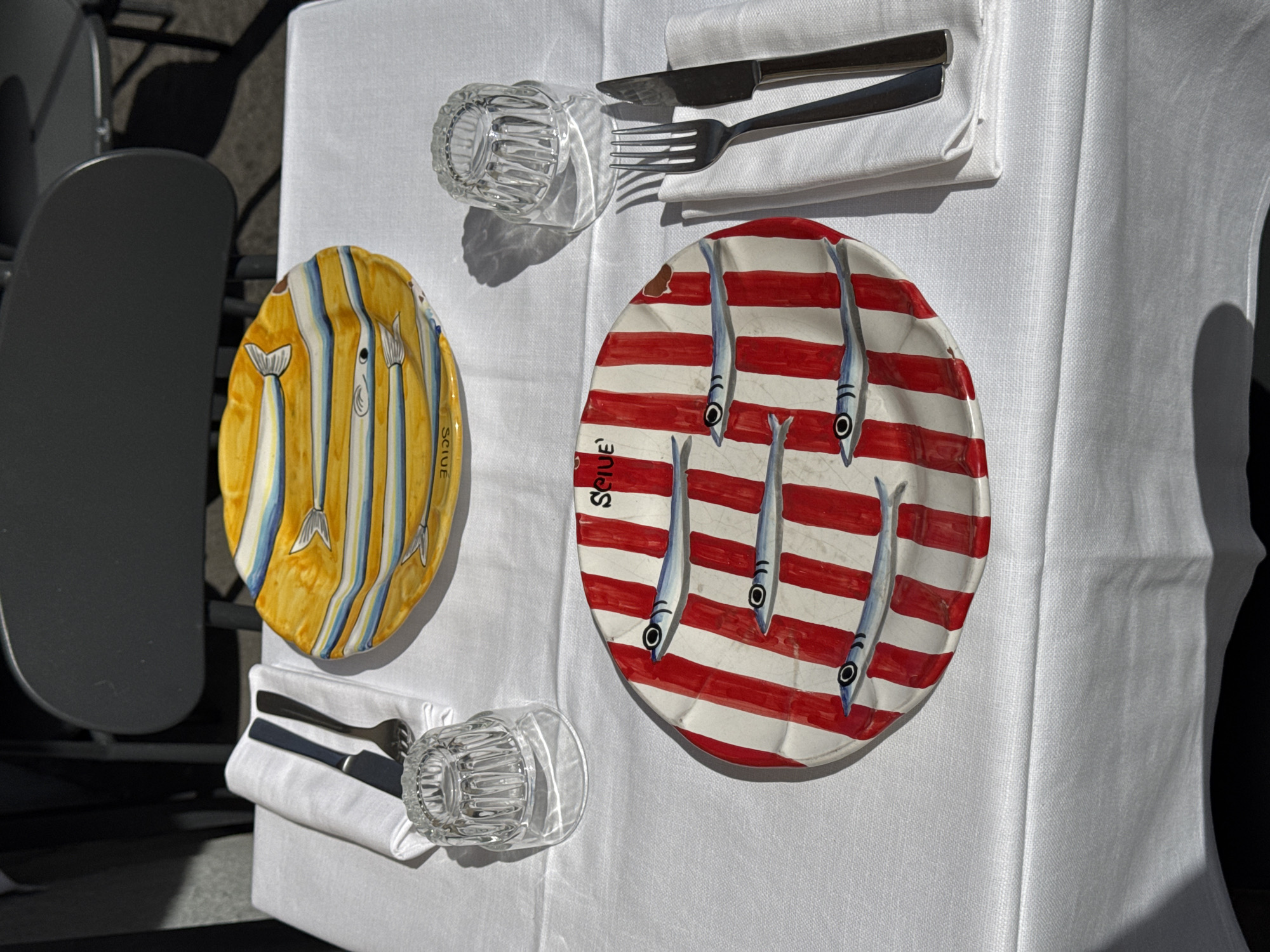 table setting in what appears to be an outdoor restaurant setting. The table is covered with a white tablecloth and holds two decorative fish-themed plates: one yellow with blue stripes and the word "SCILIE" along the edge, and the other with red stripes and white fish illustrations with the word "SCILIE" visible. Each plate has a set of silverware (knife and fork) wrapped in a white napkin and a small, clear glass with a textured exterior. A grey chair is partially visible on the left side of the frame. Based on the presence of the "SCILIE" inscription, and without additional information, it is difficult to ascertain that this image was taken in Milan, Italy.