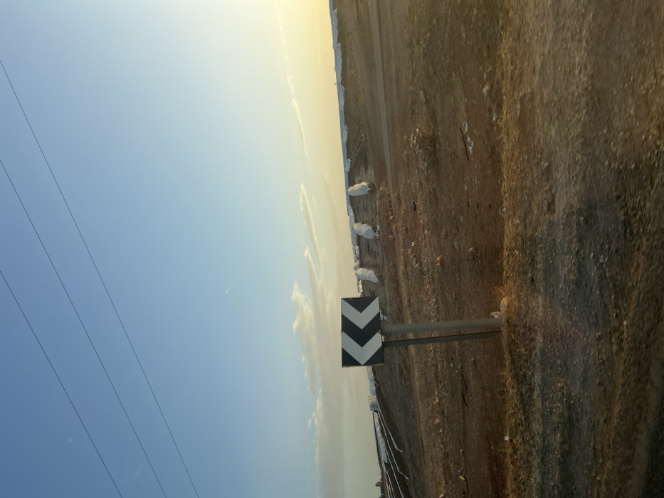 A landscape oriented image shows a road with a chevron sign in the foreground, pointing to the right. The road is to the right of the sign, with several white bags visible along its side. Above the road is a clear, blue sky with a few thin clouds near the horizon. Power lines run along the left side of the image. The horizon has a pale yellowish hue, suggesting either sunrise or sunset.