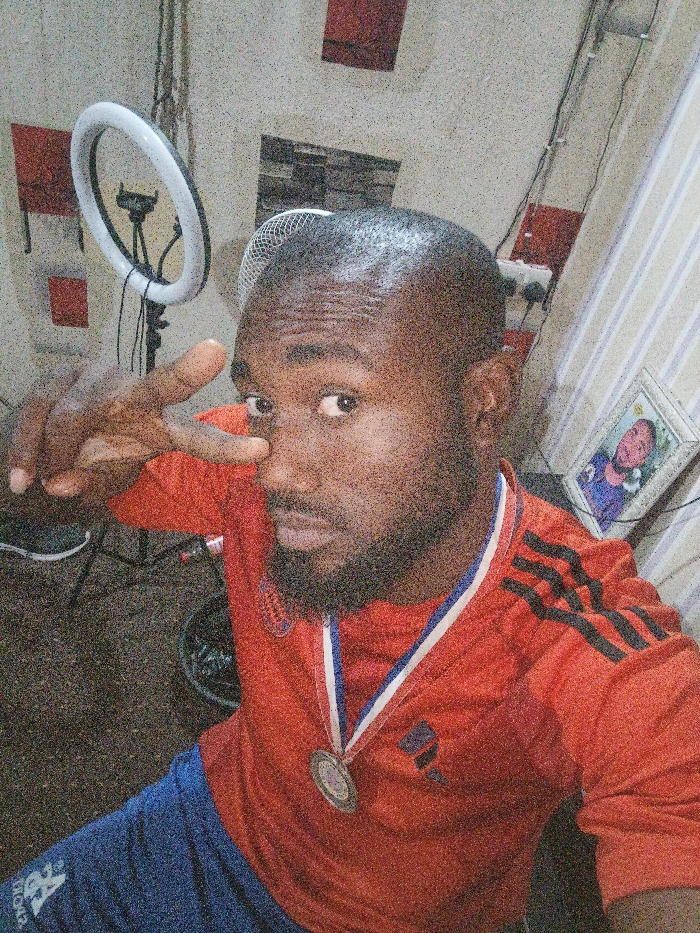 A person with dark hair and a beard wears an orange shirt with black stripes and a medal on a ribbon around their neck. They are holding up a peace sign near their face. In the background, there is a ring light, a wall with striped wallpaper, and a picture frame hanging on the wall. The image is slightly grainy. The person appears to be looking directly at the camera.