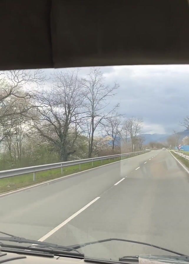 man driving a van on a wet road with trees on the side. The driver is wearing a green vest and brown pants. He has a cigarette in his hand. The interior of the car is a bit old. On the dashboard, there are some items. You can see mountains in the distance.