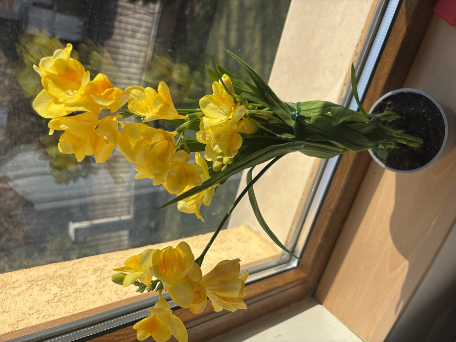 - "A potted plant containing numerous bright yellow freesia blossoms and slender green leaves is positioned on a light-colored wooden windowsill" by FM-U7bYK2, licensed under CC BY 4.0