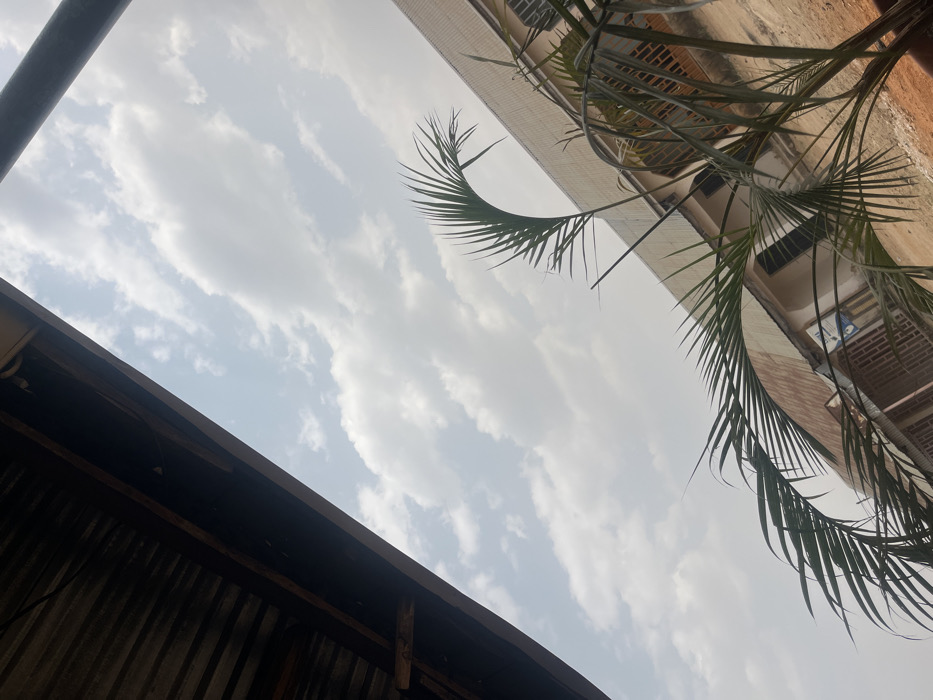 The image displays an upward-angled view of an outdoor scene in Barakin Akawo, Nigeria. The upper-left quadrant is occupied by the underside of a dark, corrugated metal roof structure supported by visible wooden beams. The sky, visible through the opening, is light blue with scattered white cumulus clouds. A palm-like plant with prominent green fronds extends from the lower-right to the mid-right portion of the frame. In the background, on the right side, a building with a light-colored upper facade and a darker roof is visible, featuring several rectangular windows. Below this, a section of a building with a brownish facade is present. The ground in the lower-right appears to be reddish-brown, unpaved earth. A dark vertical pole is partially visible on the far right edge. No individuals or specific actions are depicted.